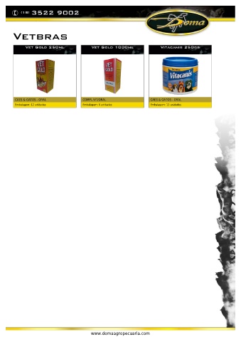 (18) 3522 9002 Vetbras Vet Gold 250ml Vet Gold 1000ml Vitacanis 250gr CAES & GATOS - ORAL COMPL.VIT/ORAL CAES & GATOS - ORAL Embalagem: 12 unidades Embalagem: 6 unidades Embalagem: 12 unidades www.domaagropecuaria.com