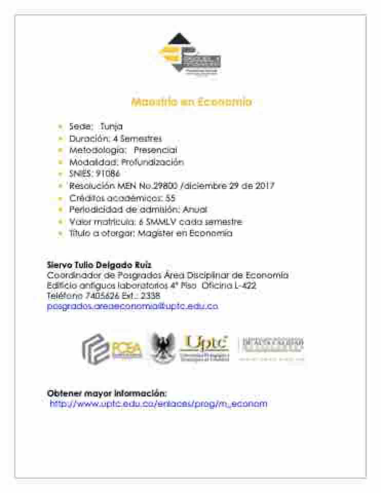 Coordinador de Posgrados Área Disciplinar de Economía Edificio antiguos laboratorios 4o Piso Oficina L-422 Teléfono 7405626 Ext.: 2338 posgrados.areaeconomia@uptc.edu.co
