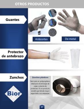 OTROS PRODUCTOS Guantes Anticortes De metal Protector de antebrazo Zunchos Zunchos plásticos Fabricado en polipropileno, ideal para el embalaje de cajas o amarre de productor. Es un producto versátil que brinda mayor seguridad a sus empaque. 37