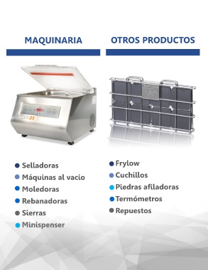 MAQUINARIA OTROS PRODUCTOS Selladoras Frylow Máquinas al vacío Cuchillos Moledoras Piedras afiladoras Rebanadoras Termómetros Sierras Repuestos Minispenser