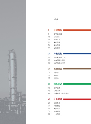 目录 7 ⋺㢄₷ 9 董事长致辞 10 公司简介 12 企业文化 14 组织架构 16 企业荣誉 19 企业资质 21 ᶩᴜ䷕㚆 22 石化检维修工程 27 装备研发与制造 28 技术咨询与服务 31 ⋓⭗峱⺆ 32 规模化 35 精益化 37 国际化 39 ℝ㒲楳↪ 40 技术创新 42 管理进步 44 检维修十大特色技术 47 䡀Ḝ尥᷽ 49 抢险救援 51 纳税贡献 52 关爱员工 54 慈善捐助 55 社会就业 H Q JOEE