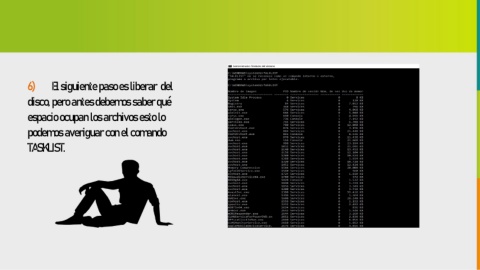 6) El siguiente paso es liberar del disco, pero antes debemos saber qué espacio ocupan los archivos esto lo podemos averiguar con el comando TASKLIST. GC-F-004 V.01