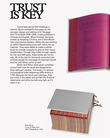 SHV Think Book 1996–1896, it was published in Chinese and English. When finished, the book ended up weighing 3.5 kilos, and it shot Bloom into international stardom. While she was working on SHV’s Shareholding book with Yohon the art historian. They were asked to make a jubilee book for a trade company to give to their future shareholders. Though they made enough copies for the next 500 years, these books are not for sale. All of the text for this book came from the archives except for one page of important words that her and Yohon came up with.