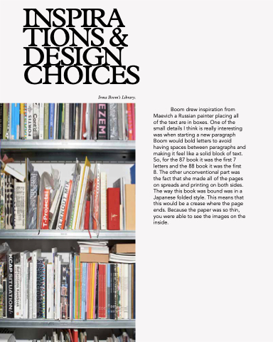 of the text are in boxes. One of the small details I think is really interesting was when starting a new paragraph Boom would bold letters to avoid having spaces between paragraphs and making it feel like a solid block of text. So, for the 87 book it was the first 7 letters and the 88 book it was the first 8. The other unconventional part was the fact that she made all of the pages on spreads and printing on both sides. The way this book was bound was in a Japanese folded style. This means that this would be a crease where the page ends. Because the paper was so thin, you were able to see the images on the inside.