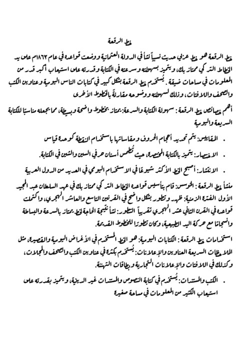 خط الرقعة هو خط عربي حديث نسب ًبا نسا في الدولة العثمايبة ووضعث قواعده في عام 1863م على يد