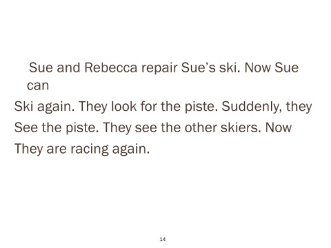 Sue and Rebecca repair Sue’s ski. Now Sue can Ski again. They look for the piste. Suddenly, they See the piste. They see the other skiers. Now They are racing again. 14
