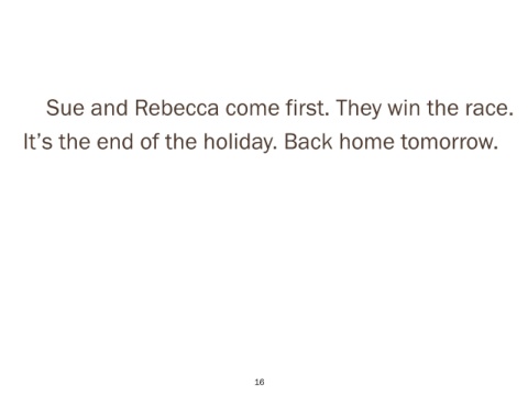 Sue and Rebecca come first. They win the race. It’s the end of the holiday. Back home tomorrow. 16