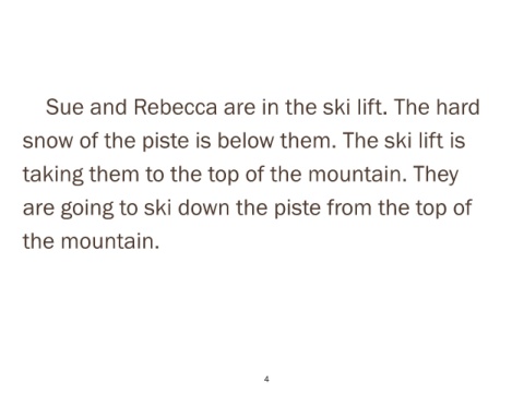 Sue and Rebecca are in the ski lift. The hard snow of the piste is below them. The ski lift is taking them to the top of the mountain. They are going to ski down the piste from the top of the mountain. 4