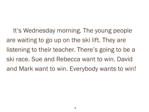 It’s Wednesday morning. The young people are waiting to go up on the ski lift. They are listening to their teacher. There’s going to be a ski race. Sue and Rebecca want to win. David and Mark want to win. Everybody wants to win! 6