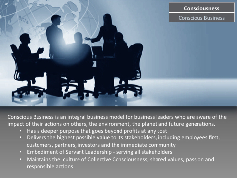Conscious Business is an integral business model for business leaders who are aware of the impact of their ac8ons on others, the environment, the planet and future genera8ons.