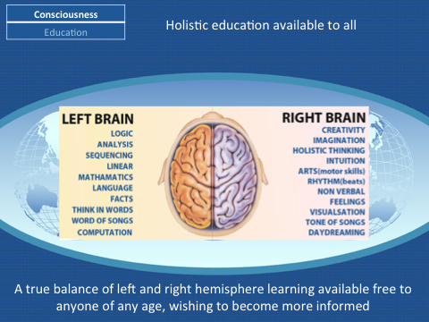 Consciousness Educa8on Holis8c educa8on available to all A true balance of leS and right hemisphere learning available free to anyone of any age, wishing to become more informed