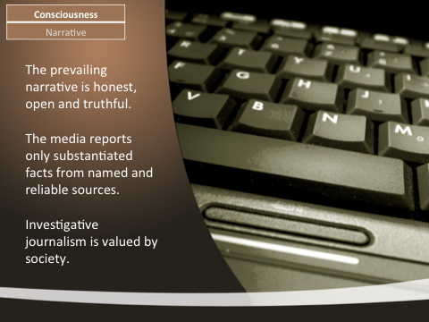 Consciousness Narra8ve The prevailing narra8ve is honest, open and truthful. The media reports only substan8ated facts from named and reliable sources. Inves8ga8ve journalism is valued by society.