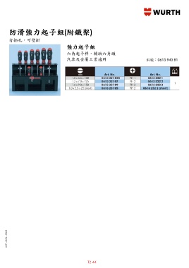 防滑滑強強力起子組力起子組((附鐵架附鐵架)) 防 防防滑滑強強力起子組力起子組((附鐵架附鐵架)) 有插孔,可壁掛 強力起子組力起子組 強力起子組強力起子組 強 六角起子桿,輔助六角頭 汽車及金屬工業適用 料號:0613 940 81 MWF – 02/04 – 09405 T2 44