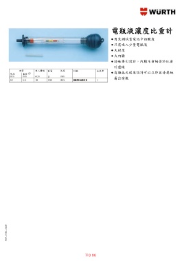 電瓶液濃度比重計瓶液濃度比重計 電 電瓶液濃度比重計電瓶液濃度比重計 ● 用來測試蓄電池中的酸度 ● 只需吸入少量電瓶液 ● 大刻度 ● 大內膽 ● 特殊導引設計,內膽不會附著於比重 計邊緣 ● 有顏色之刻度設計可以立即並清楚地 看出讀數 MWF –10/03 – 06551 T13 08