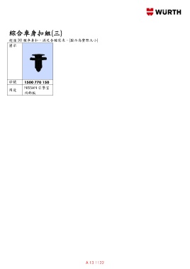 綜 綜合車身扣組綜合車身扣組((三三)) 綜合車身扣組合車身扣組((三三)) 超過 30 種車身扣,滿足各種需求。(圖示為實際大小) 圖示 料號 1500 770 150 NISSAN 引擎室 用途 內飾板 A 13 1122