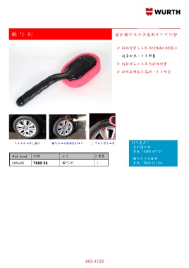 輪 胎 刷 搭配輪胎亮光保護劑使用於胎壁 刷柄材質為尼龍 66 (Nylon 66)製成 超高韌性、不易斷裂 刷拭綿為日本專利特殊材質 特殊黏膠黏合處理,不易脫落 前 後 附加產品: 失去表面光澤之輪胎 輪胎亮光保護劑塗刷施作 立即享有潔亮光澤 塑料還原劑 料號:0893 477 01 規格 (mm) 料號 品名 包裝量 輪胎亮光保護劑 285x90 T585 25 輪胎刷 1 料號:T890 121 04 A05 4150