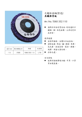 尼龍除漆輪(紫色) 具 具纖維背板纖維背板 具具纖維背板纖維背板 Art. No. T585 332 115 適用於所有材質表面。特別適於不 鏽鋼、鋼、無色金屬、上漆或是合 成素材。 應用範圍 清潔焊接縫、金屬和合成表面。 清除起霜、煤渣、鏽、腐蝕、灰塵、 氧化層、表面塗層、舊漆、樹脂、 直徑 mm 最大轉速 /分 料號 包裝量 殘膠、殘留之密封劑。 115 7500 T585 332 115 1/10 去除毛邊。 安全措施 使用時請佩帶護目鏡、耳罩、口罩 等防護裝備。