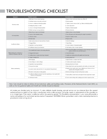Motor overheating 5. Incorrect motor (service factor 1.0, low ambient temperature) 5. Replace motor with correct open, NEMA service factors (1.15 or