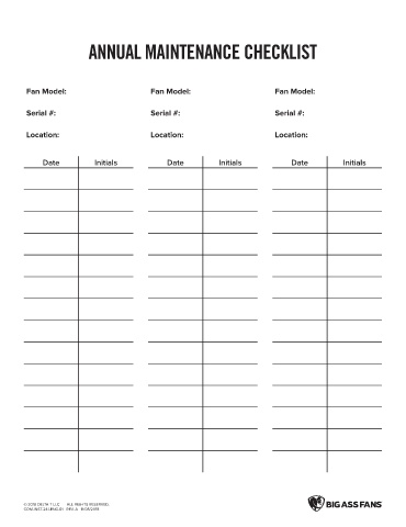 ANNUAL MAINTENANCE CHECKLIST Fan Model: Fan Model: Fan Model: Serial #: Serial #: Serial #: Location: Location: Location: Date Initials Date Initials Date Initials © 2018 DELTA T LLC ALL RIGHTS RESERVED. COM-INST-241-ENG-01 REV. A 11/08/2018