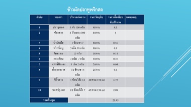 ล าดับ รายการ ปริมาณต่อจาน ราคาวัตถุดิบ ราคาเมื่อเทียบ หมายเหตุ