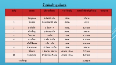 ล าดับ รายการ ปริมาณต่อจาน ราคาวัตถุดิบ ราคาเมื่อเทียบกับปริมาณ หมายเหตุ