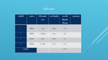 น ้าฝรั่ง (203) ล าดับที่ รายการ ปริมาณต่อ ราคาวัตถุดิบ ราคาเมื่อ หมายเหตุ จาน เทียบกับ ปริมาณ 1 ฝรั่งสด 1 ลูก 30/ลูก 30 2 เกลือป่น ( ½) ช้อนชา 25/กก 0.62 3 น ้าเปล่า 1 ถ้วย 9/ขวด 4.5 4 น ้าเชื่อม ( ½ ) ถ้วย 25/กก 0.62 รวมต้นทุน 35.74