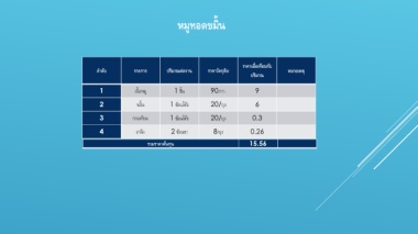 หมูทอดขมิ้น ราคาเมื่อเทียบกับ ล าดับ รายการ ปริมาณต่อจาน ราคาวัตถุดิบ หมายเหตุ ปริมาณ 1 เนื้อหมู 1 ชิ้น 90/กก. 9 2 ขมิ้น 1 ช้อนโต๊ะ 20/ถุง 6 3 กระเทียม 1 ช้อนโต๊ะ 20/ถุง 0.3 4 เกลือ 2 ช้อนชา 8/ถุง 0.26 รวมราคาต้นทุน 15.56
