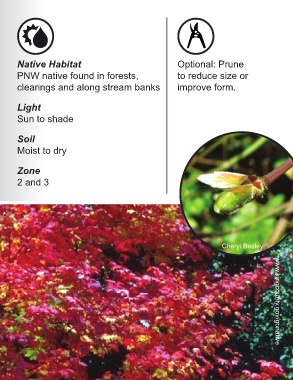Native Habitat Optional: Prune PNW native found in forests, to reduce size or clearings and along stream banks improve form. Light Sun to shade Soil Moist to dry Zone 2 and 3 Cheryl Bosley www.kingcounty.gov/gonative