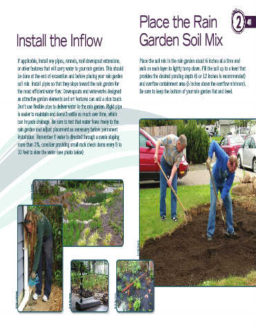 If applicable, install any pipes, runnels, roof downspout extensions,      Place the soil mix in the rain garden about 6 inches at a time and