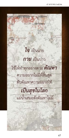 ธรรมนุสรณ์ พระครูบาเจ้าบุญชุ่ม ญาณสํวโร ๕ มกราคม ๒๕๖๒ ใจ เป็นนำย กาย เป็นบ่ำว ใช้ให้ท�ำทุกอย่ำงตำม ตัณหา ควำมอยำกไม่มีที่สิ้นสุด ดับตัณหำควำมอยำกได้ เป็นสุขในโลก แม่น�้ำเสมอดังตัณหำไม่มี พระครูบำเจ้ำบุญชุ่ม ญำณส�วโร อรัญวำสีภิกขุ 66 67