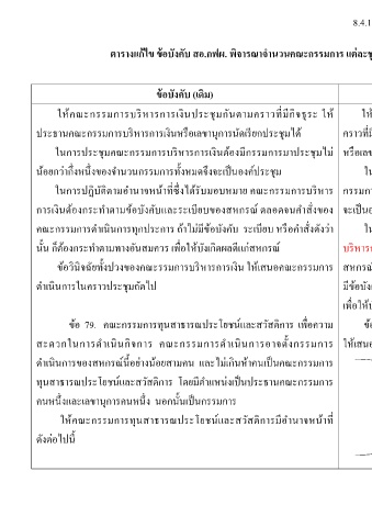 8.4.19 ตารางแก้ไข ข้อบังคับ สอ.กฟผ. พิจารณาจํานวนคณะกรรมการ แต่ละชุดตามข้อบังคับของสหกรณ์ และ พรบ.สหกรณ์ ฉบับที่ 3 พ.ศ.2562 เหตุผล ข้อบังคับ (ใหม่) ให้ คณะกรรมการบริหารการเงินและการลงทุน ประชุมกันตาม คราวที่มีกิจธุระ ให้ประธานคณะกรรมการบริหารการเงินและการลงทุน หรือเลขานุการนัดเรียกประชุมได้ ในการประชุมคณะกรรมการบริหารการเงินและการลงทุนต้องมี กรรมการมาประชุมไม่น้อยกว่ากึ่งหนึ่งของจํานวนกรรมการทั้งหมดจึง จะเป็นองค์ประชุม ในการป