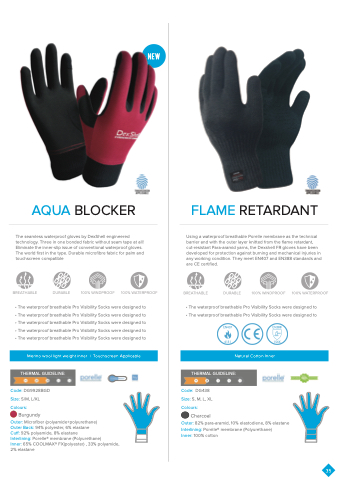 Using a waterproof breathable Porelle membrane as the technical barrier and with the outer layer knitted from the flame retardant, cut-resistant Para-aramid yarns, the Dexshell FR gloves have been developed for protection against burning and mechanical injuries in any working condition. They meet EN407 and EN388 standards and are CE certified.