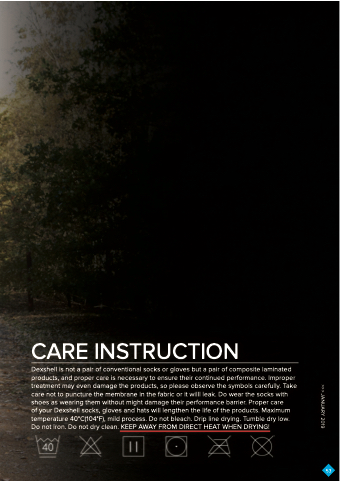 Dexshell is not a pair of conventional socks or gloves but a pair of composite laminated products, and proper care is necessary to ensure their continued performance. Improper treatment may even damage the products, so please observe the symbols carefully. Take care not to puncture the membrane in the fabric or it willl leak. Do wear the socks with shoes as wearing them without might damage their performance barrier. Proper care