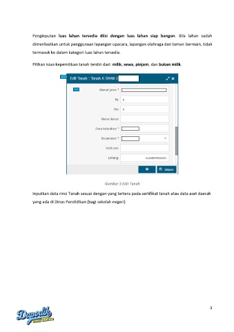 Pilihan isian kepemilikan tanah terdiri dari: milik, sewa, pinjam, dan bukan milik.