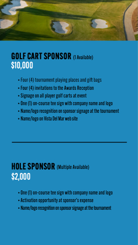 • Name/logo recognition on sponsor signage at the tournament • Name/logo on Vista Del Mar web site