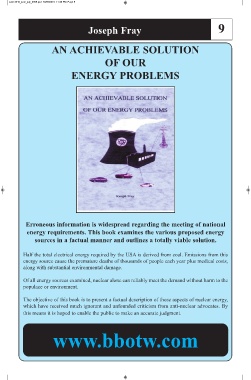 June 2010_june_july_2009.qxd 30/06/2010 11:46 PM Page 9 Joseph Fray 9 AN ACHIEVABLE SOLUTION OF OUR ENERGY PROBLEMS Erroneous information is widespread regarding the meeting of national energy requirements. This book examines the various proposed energy sources in a factual manner and outlines a totally viable solution. Half the total electrical energy required by the USA is derived from coal. Emissions from this energy source cause the premature deaths of thousands of people each year plus medical costs, along with substantial environmental damage. Of all energy sources examined, nuclear alone can reliably meet the demand without harm to the populace or environment. The objective of this book is to present a factual description of those aspects of nuclear energy, which have received much ignorant and unfounded criticism from anti-nuclear advocates. By this means it is hoped to enable the public to make an accurate judgment. www.bbotw.com