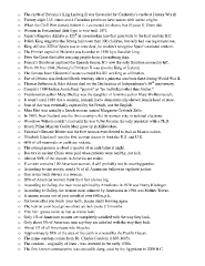 o The castle of Bavaria’s King Ludwig II was the model for Cinderella’s castle at Disney World. o Twenty-eight U.S. states and 4 Canadian provinces have names with native origins. o When the Civil War started, Robert E. Lee owned no slaves, but Ulysses S. Grant did. o Women in Switzerland didn’t get to vote until 1971. th o Japan’s Emperor Akihito is 125 in an unbroken line that goes back to the first century B.C. o Polish King Augustus the Strong had more than 300 children, but only had one legitimate son. o King Alfonso XIII of Spain was so tone deaf, he couldn’t recognize Spain’s national anthem. o The Finnish capital of Helsinki was founded in 1550 by a Swedish king. o Peter the Great died after rescuing people from a foundering ship. o France’s Bourbons captured the Spanish throne. It’s now the only Bourbon monarchy left. o From 1918 to 1944, Norway’s Christian X was also the King of Iceland. o The famous lover Giovanni Casanova ended his life working as a librarian. o Part of Ottawa was declared Dutch territory when a princess was born there during World War II. th o Thomas Jefferson & John Adams died on the Declaration of Independence’s 50 anniversary. o Canada’s 1880 Indian Act defined “person” as “an individual other than Indian.” o Frankenstein author Mary Shelley was the daughter of feminist author Mary Wollstonecraft. o It wasn’t until 1980 that a country, Iceland, had a democratically elected female head of state. o Joan of Arc was eventually captured by the French, not the English. o Mata Hari was actually a Dutch woman named Margarete Gertrude Zelle. o In 1893, New Zealand was the first country to let its women vote in national elections. o Woodrow Wilson couldn’t read until he was 9, but became the only president with a Ph.D. o Israeli Prime Minister Golda Meir grew up in Milwaukee. o Pakistan’s Benazir Bhutto was the first woman ever elected to lead an Islamic nation. o Elizabeth Blackwell was the first woman doctor in both the U.S. and U.K. o 60% of all mammals on earth are rodents. o The average person is about a quarter of an inch taller at night. o Doctors in ancient China were paid when patients were healthy, not sick. o Almost 90% of the doctors in America are males. o If a room contains 100 American women, 4 will probably not be wearing panties. o According to one survey, nearly ¾ of all Americans believe in vigilante justice. o One in ten truck drivers is a woman. o 20% of American women think their feet are too big. o According to Gallup, the man most admired by Americans in 1974 was Henry Kissinger. o According to Gallup, the woman most admired by Americans in 1986 was Mother Teresa. o A sneeze zooms out of your mouth at over 600 m.p.h. o Six hours after you brush your teeth, plaque starts forming again. o The hair on your head grows about an inch every 2-3 months. o Fine hair grows twice as fast as coarse hair. o Only 1% of American women are completely satisfied with the way they look. o Only about 5% of American men say they are satisfied with the way they look. o About 1/3 of all Americans ride bicycles. o Approximately 50% of the area of the earth is covered by the Pacific Ocean. o The name condom comes from Dr. Charles Condom (1630-1685). o The condom - originally of linen - was invented in the early 1500s. o The first known contraceptive was crocodile dung, used by the Egyptians in 2000 B.C.