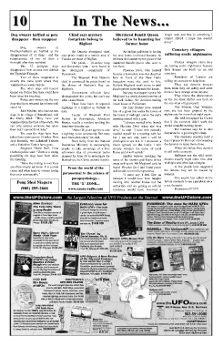 10 In The News... 10 In The News... Dog owners baffled as pets Chief says mystery Murdered Bandit Queen longer wait and that is something I Dog owners baffled as pets Chief says mystery Murdered Bandit Queen disappear - then reappear footprints belong to believed to be haunting her cannot afford. I hope she doesn't believed to be haunting her footprints belong to disappear - then reappear former home Bigfoot former home mind." Bigfoot Dog owners in Cemetery villagers Northumberland are baffled at the An Ontario aboriginal chief An Indian politician is having Cemetery villagers suffering erotic nightmares disappearance of 12 dogs - and the says prints found in a remote area of his new home exorcised because he suffering erotic nightmares reappearance of two of them a Canada are those of Bigfoot. believes it's haunted by the ghost of the fortnight after they vanished. The prints - 14-inches long murdered Bandit Queen who used to Chilean villagers claim they The 12 pedigree dogs and five-inches wide - were found in live there. are having erotic nightmares because disappeared from an area now dubbed the aboriginal community of Phoolan Devi, who herself their homes are built on an old the Tynedale Triangle. Peawanuck. became a lawmaker, was shot dead last cemetery. Two of them reappeared at The Weenusk First Nation's July in front of the New Delhi Residents of Lautaro are exactly the same sport where they chief is convinced the prints found on bungalow were she used to live. calling on exorcists to help them. vanished two weeks before. the shores of Hudson's Bay are Kailash Meghwal won't move in until They say demons possess The other dogs still haven't Bigfoot's. Hindu priests have blessed the house. them when they are asleep and cause turned up. Police fear they could have Government officials have Navyug newspaper reports Mr them to have strange erotic dreams. been taken for breeding. photographed the prints, but can't say Meghwal is a newly elected member of They blame the phenomenon Police and owners say the two what caused them. the Lok Sabha, the decision-making on the fact their district was built on dogs that have returned have been well There have been 16 reported lower house of Parliament. the site of an old graveyard. cared for. sightings of a Bigfoot in Ontario to He says friends have warned One woman, Olga Venegas, Julie Medlen, who has lost two date. him of a ghost that walks the lawns of says she has been gripped by the dogs in he village of Blanchland, told Leader of Weenusk First the house at midnight and in the early nightmares for more than eight years. the Daily Mail: "They have just Nation in Peawanuck, Abraham morning armed with a gun. She told newspaper La Cuarta vanished from the face of the earth. We Hunter, recalls a resident spotting the "I always wanted to be friends that if the exorcism didn't work she can only assume someone has taken beast two decades ago. with Phoolan Devi when she was would consider moving house. them but I cannot think why." "About 20 years ago there was alive," he said. "I have now mentally Her husband says he is also The area the dogs have been a sighting in our community. But none readied myself for a meeting with her desperate for a good night's sleep. taken from spans across 15 miles. Nine have been seen since," he said. but I am not very sure I will be The residents recently held a Jack Russells, two Lakeland Terriers Brett Kelly from the Natural privileged to see her. If I encounter a day of prayer in the hope of persuading and a Yorkshire Terrier have gone. Resources Ministry is encouraging bhoot (ghost) on the lawns l will the demons to leave them alone. Sergeant Eddie Bell, from people to take advantage of a free simply whisper the name of Lord When this failed, they decided Durham police said: "There is a strong admission day at provincial parks Rama and it will vanish." to call in the exorcists. possibility the dogs have been taken planned for June 24 to investigate for Hindus believe invoking the Sufferers say the wild erotic for breeding. themselves, the Canoe website reports. name of the warrior god Rama drives dreams usually begin some time after "Once the mating is over they away evil spirit. Mr Meghwal said he midnight and often last all night. are often simply set loose. It is a cruel From the world of the hoped Phoolan Devi had found peace A few people have suggested From the world of the crime and often leads to owners losing and would not mind his presence. the dreams may not be caused by paranormal to the science of their pets permanently." paranormal to the science of "I must say I feel like an demons. parapsychology... intruder. I would have been happier One sceptic has called on his parapsychology... Feng Shui Niagara THE ‘X’ ZONE... moving into another house but the fellow residents to see a psychiatrist or Feng Shui Niagara THE ‘X’ ZONE... (905) 295-2666 www.xzone-radio.com authorities told me getting an official a sex therapist. (905) 295-2666 www.xzone-radio.com Hmmmmm!?!?!?!? residence would have involved a