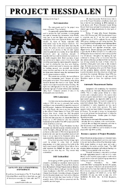 PROJECT HESSDALEN 7 PROJECT HESSDALEN 7 Continued from Page 6 UK based researcher Paul Devereux who is part of the Project Hessdalen consultancy team and Instrumentation was at the for day workshop in l994 continues to Instrumentation work closely with Project Hessdalen leader Erling The instruments used for the project were Strand. Both have ventured far and wide to research many and varied. They included: similar types of light phenomenon in other parts of A camera with a special filter which could be the world. used to analyse the light spectrum. A seismograph Today, 17 years after Project Hessdalen, was used to measure any movements in the Earth's where UFO Norway and UFO Sweden joined forces crust, just in case the lights were related to small to complete one of, if not the most complete earthquakes. None were registered. Radar recordings scientific study of UFO's conducted by any civilian totalled 36, three of which coincided with UFO group, sightings are still being reported. The observations made by the projects observers. Two local population still regularly report sightings direct photos of the radar screen were taken depicting the to UFO Norway. Local people have reported both returns. The project also used a spectrum analyser lights-in-the-sky and apparent structured, cigar- connected to an antenna so that all radio signals shaped UFOs. Recent sightings (year 2001) include could be monitored on a screen. At no time did this a report by Mr. F. Moen on April 13. In a valley west instrument pick up anything unusual. Aof Hessdalen his son observed a fast moving light for magnetometer was used to measure any variations in over 20 minutes. Throughout the sighting the light the Earth's magnetic field. There was none. A laser continued to change colour as it moved about the was pointed at the lights a total of nine times. Eight sky. Earlier in the year, on March 28 Mr Tor Gaserud out of the nine times the lights seemed to respond to was driving towards the town of Roros when he the laser by altering the way they were flashing. observed a blue-green light close to the mountain Geiger counters were used to measure any radiation ridge. The light was observed for around 20 seconds. but nothing unusual was recorded. An infrared Right at the beginning of the year Mr Peder Gronas viewer was also used but on the two occasions when and his grandson Bjarne Lillevold were driving the lights were observed using this instrument there towards Hessdalen when they observed a bright light was no infrared radiation visible. just above the mountain. Whatever these LITS are, The camera was probably the most effective they continue to be observed in and around the of all the instruments used. Dozens of colour Hessdalen region as these few sightings clearly photographs were taken. Those taken by using a long show. exposure showed the round or oval lights. All the Automatic Measurement Station cameras were tripod mounted to reduce blurring. The Automatic Measurement Station lights were photographed in the sky, just above the mountain tops and of course down in the Hessdalen Equipment still monitoring the Hessdalen valley itself. Computer analysis of some of the valley includes an Automatic Measurement Station photographs was inconclusive. (AMS). This is a video camera linked to a video recorder and a computer system. The camera takes UFO Laboratory photos at regular intervals but it is also triggered if a UFO Laboratory light source appears. An improved AMS is on the A similar exercise was attempted again in the drawing board but funds are required to upgrade the winter of 1985, but due to extremely bad weather equipment already there. When such plans can be conditions it was not possible to repeat the success of accomplished is solely dependent on how much the l984 project. American UFO researcher, the late money can be raised from sponsors. The main Dr J. Allen Hynek, who was at one time a consultant sponsor today has been Ostfold University College to the official United States Air Force UFO study in Norway. The amount of money so far generated Project Blue Book, visited the l985 Hessdalen has not yet achieved the desired result: to solve the project. It was to be one of his last field trips before Hessdalen Phenomena. Further plans for Project he died later that same year. Dr. Hynek described the Hessdalen include: project as "a UFO laboratory" and was extremely - Expanding the Automatic Measurement Station. impressed by the results of the l984 project and of the - Develop and run a database, with a web interface. efforts of all those involved. - Analyse data and begin the necessary activities to Since that time Project Hessdalen has been find the answers to the Hessdalen Phenomena. discussed and debated in many countries around the - Develop small AMS that can be installed in other world. The lights, although still there, are not in such places with high UFO activity. profusion as they were in l984. Some equipment still Become a sponsor of Project Hessdalen monitors the area and the researchers involved still Become a sponsor of Project Hessdalen hope to set up camp in the Hessdalen valley once again should the lights return in large numbers. Project Hessdalen is run mainly on a voluntary basis, It has been speculated that the strange lights with individuals spending their own time and money could be related to some kind of weather to try and resolve the puzzle of the Hessdalen lights. phenomenon, or to lights produced by faults in the With proper funding so much more and even a earth's crust termed 'earthlights'. Some believe that a resolution to this puzzle could be found. The AMS solid structure lies behind the lights, but no one requires further equipment and without funding it is knows for sure what they are. They remain truly unlikely to be up-graded in the near future. unidentified. Financial assistance is required to purchase the right equipment, install it and set it to work. Still Unidentifi