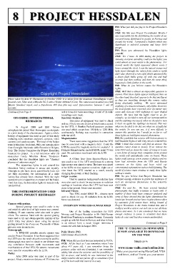 8 PROJECT HESSDALEN PROJECT HESSDALEN 8 PM: What part did you play in the Project Hessdalen team. OGR: My title was Project Co-ordinator. Mostly I was responsible for the distributing the results of our research being distributed to people in Norway and around the world. I prepared a bulletin which was distributed to selected scientists and large UFO groups. PM: Have you witnessed the Hessdalen lights yourself. OGR: Yes. I have. In l984 during the project in January, everyone attending could see the lights; you could almost set your watch to the phenomena. For several weeks the lights appeared almost every 2 hours around the clock. I saw the typical orange-red light travel through the valley from south to north and I also observed a rare sight which appeared like a dozen flash bulbs going off with one and half seconds and then nothing and then the same thing happened a little further to the north. PM: What do you believe causes the Hessdalen lights. OGR: Well that is almost an impossible question to answer. First these lights appear intelligent then on the other hand they don't appear to be that intelligent Photo taken by Arne P. Thomassen in October 1982. It is taken from the mountain Finnsåhøgda south, as they are travelling through this remote valley towards east. ARne used a Minolta XG-2 with a Vivitar 400mm/5,6 lens. The camera was mounted on a Slik doing absolutely nothing. We never witnessed Master Standard tripod, and a Fujichrome 400 dias film was used. Exposuretime: between 5 and 10 anything of a structured nature, only lights. However, seconds. the local people have reported close encounter type Continued from Page 8 and at times did make recordings. A total of 36 radar cases and close-up UFO sightings of cigar shaped recordings were made. objects. We have had the lights react to us, for ON-GOING INTERNATIONAL Spectrum Analyser. example, we decided to turn off our instrumentation ON-GOING INTERNATIONAL RESEARCH This piece of equipment was used to check and the sightings increased, when we decided to turn RESEARCH and see if there was any electrical interference caused it back on again the sightings decreased. This was In August 2000 and 2001 Italian by the LITS. A Hewlett Packard spectrum analyser when we decided to do this not when we actually hit astrophysicists joined their Norwegian counterparts was used which swept from 150 kHz to 1250 MHz the switch. So you can see, it if very difficult to in a joint study of the phenomenon. Again a whole continuously. Nothing was recorded in connection answer this question but I would go as far to call battery of equipment was used as part of this study with the LITS. these lights an intelligent natural phenomena. including radio spectrum analysers, cameras, video Magnetometer. PM: Do you think that science will find an answer to cameras and spectroscopes. The head of the Italian There were some suggestions that the LITS the Hessdalen lights or will they remain unidentified. team is Massimo Teodorani, PhD, and astrophysicist may be associated with a magnetic field. Could the OGR: I think that science will find an answer. The from Consiglio Nazionale delle Ricerche in Bolgna, LITS be caused by magnetic storms for example? A question comes down to money. If we remove the Italy. The Italian Committee for Project Hessdalen Fluxgate Magnetometer, model FM100, serial 73 was term UFO and go down the route of trying to locate financed his project. In a full interview with US used. No correlation was found with the LITS. a new form of energy then companies from around researcher Linda Moulton Howe Teodorani Laser. the world will undoubtedly come on board. These concluded that the Hessdalen lights are "Thermal A 633nm laser from Spectra-Physics Inc. lights could open up a new avenue of physics and we plasmas of unknown origin". was used to see if the LITS would react to a strong have had scientists from the USA and Russia The mysterious lights in and around the light source was aimed at them. The laser was aimed comment on the lights and have ruled out Hessdalen Valley continue to amaze and mystify. at the LITS on nine separate occasions. Eight out of conventional explanations such as ball lightning. The Attempts to pin them down scientifically have not nine times the LITS reacted as a result, usually world of science must continue to study these lights yet fully succeeded, but information of a wide changing the pattern of their flashing. without a doubt. variety has already been obtained. With the right Geiger counter. PM: Do you believe that Project Hessdalen has sponsorship it is hoped that an answer will be found. Used to measure background radiation they obtained enough evidence to prove the existence of Until that time, the Hessdalen lights do remain truly were also used to check for any increase in radiation such an anomalous phenomena to the scientific 'unidentified'. readings in locations where the LITS had been seen community. close to the ground. None were recorded. OGR: Yes and No. We have several hundred THE INSTRUMENTATION USED Infrared Viewer. photographs that baffle scientists to begin with. A THE INSTRUMENTATION USED DURING PROJECT HESSDALEN Two FJM, model 80045 IR - viewers were number of these have been computer analysed and DURING PROJECT HESSDALEN used to check for any IR radiation from the LITS. some of these showed that the lights illuminated the None was detected. landscape beneath and we have regular photos taken Camera with grating. by automatic field station there. Erling Strand of Special gratings were used in order to try INTERVIEW WITH ODD-GUNNAR ROED Project Hessdalen is the brain behind this and it and establish what kind of light source was present. really is worth a visit to our web site to see all these Ordinary 35 mm cameras were also used to great One of the leading researchers for UFO photos and more. So I am convinced that we have effect. The cameras fitted with the special grating Norway and Project Hessd