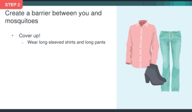 STEP 2 Create a barrier between you and mosquitoes • Cover up! » Wear long-sleeved shirts and long pants