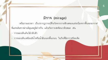 - การมองเห็นเหมือนมีน้ําหรือน้ํามันนองพื้นถนน ในวันที่มีอากาศรอนจัด