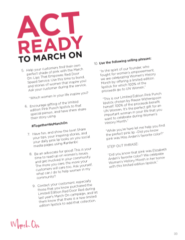 5. Helpyourcustomers ndtheirown perfect shade of pink with the March On: Lips That Empower, Red Door Speed Service. Use this time to bond, and stories of women that inspire you! Ask your customer during the service,