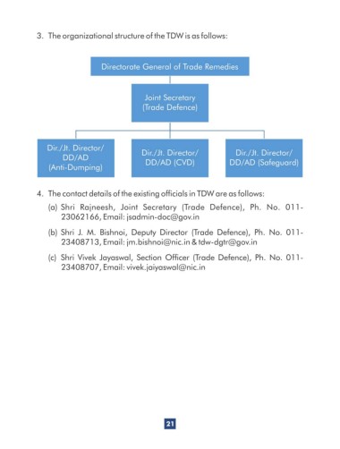 3. The organizational structure of the TDW is as follows: Directorate General of Trade Remedies Joint Secretary (Trade Defence) Dir./Jt. Director/ Dir./Jt. Director/ Dir./Jt. Director/ DD/AD (Anti-Dumping) DD/AD (CVD) DD/AD (Safeguard) 21