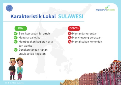 Karakteristik Lokal SULAWESI DOs DON’Ts Bersikap sopan & ramah Memandang rendah Menghargai etika Menyinggung perasaan Membedakan kegiatan pria Memaksakan kehendak dan wanita Gunakan tangan kanan untuk setiap kegiatan 14 Lintas Budaya