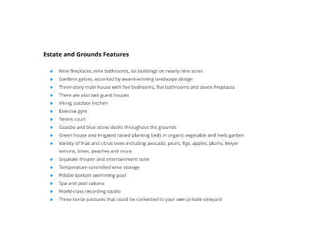 - Three-story main house with five bedrooms, five bathrooms and seven fireplaces