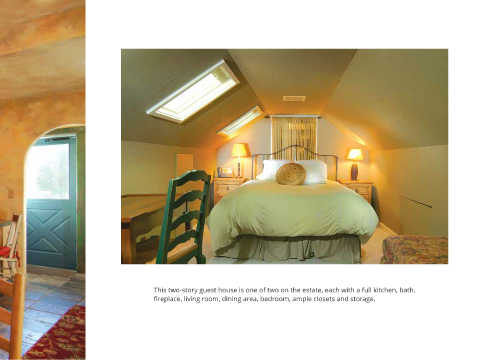 This two-story guest house is one of two on the estate, each with a full kitchen, bath, fireplace, living room, dining area, bedroom, ample closets and storage.