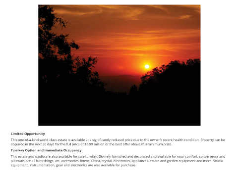 This estate and studio are also available for sale turnkey. Divinely furnished and decorated and available for your comfort, convenience and
