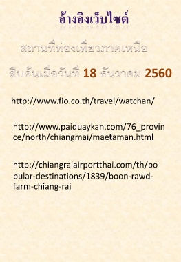 http://www.fio.co.th/travel/watchan/ http://www.paiduaykan.com/76_provin ce/north/chiangmai/maetaman.html http://chiangraiairportthai.com/th/po pular-destinations/1839/boon-rawd- farm-chiang-rai