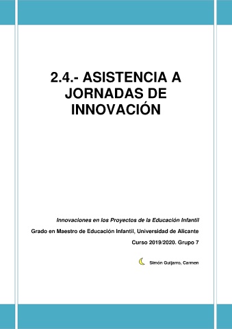 2.4.- ASISTENCIA A JORNADAS DE INNOVACIÓN Innovaciones en los Proyectos de la Educación Infantil Grado en Maestro de Educación Infantil, Universidad de Alicante Curso 2019/2020. Grupo 7 Simón Guijarro, Carmen 1